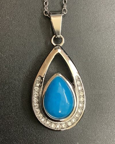 Zilverkleurige RVS hanger in druppel vorm met een blauwe steen en zirkonia