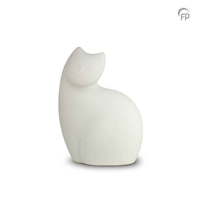 Naast deze witte versie, kan deze zittende poes urn ook worden geleverd in het donkergrijs.